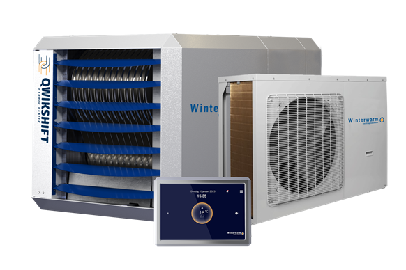 De Qwikshift QSG is een hybride luchtverwarmer bestaande uit een warmtepomp, een gasgestookte booster en een slimme regeling.
